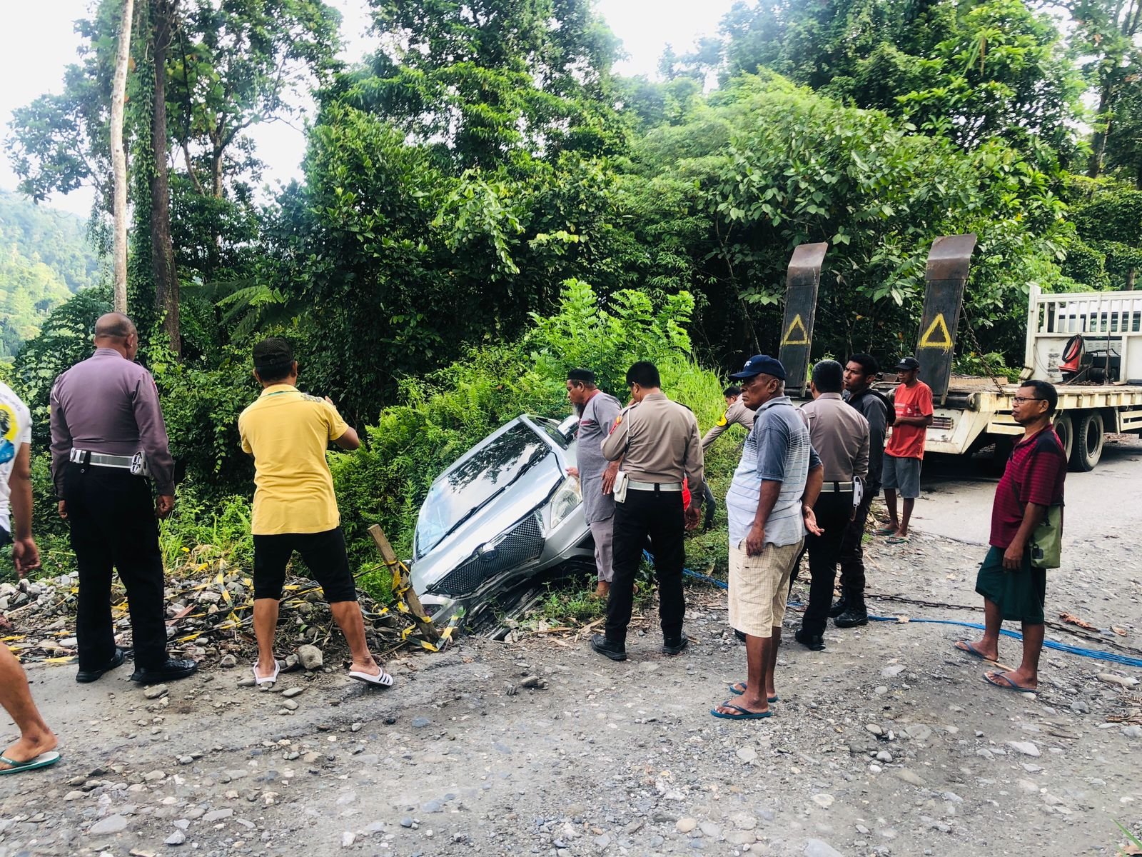 “Sopir terkejut dan berusaha menghindar ke sisi kiri jalan, namun kendaraan sudah terperosok ke lubang yang berada dekat jurang hingga akhirnya terbalik,” jelasnya.
