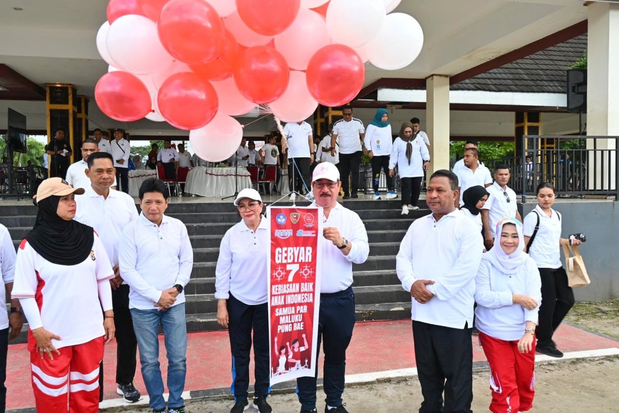 Gubernur Maluku, Hendrik Lewerissa, didampingi Wakil Gubernur, Abdullah Vanath, Sekretaris Daerah, Sadali Ie, melepas balon sebagai tanda pembukaan acara saat Peringatan Hari Anak Nasional sekaligus Pencanangan 7 Kebiasaan Baik Anak Indonesia yang dihadiri siswa-siswi SMA/SMK sederajat dan Sekolah Luar Biasa di Lapangan Merdeka Ambon, Rabu 23 Juli 2025. (MA/RM)